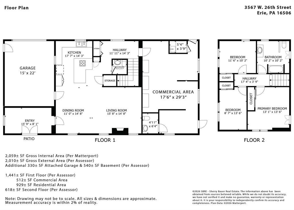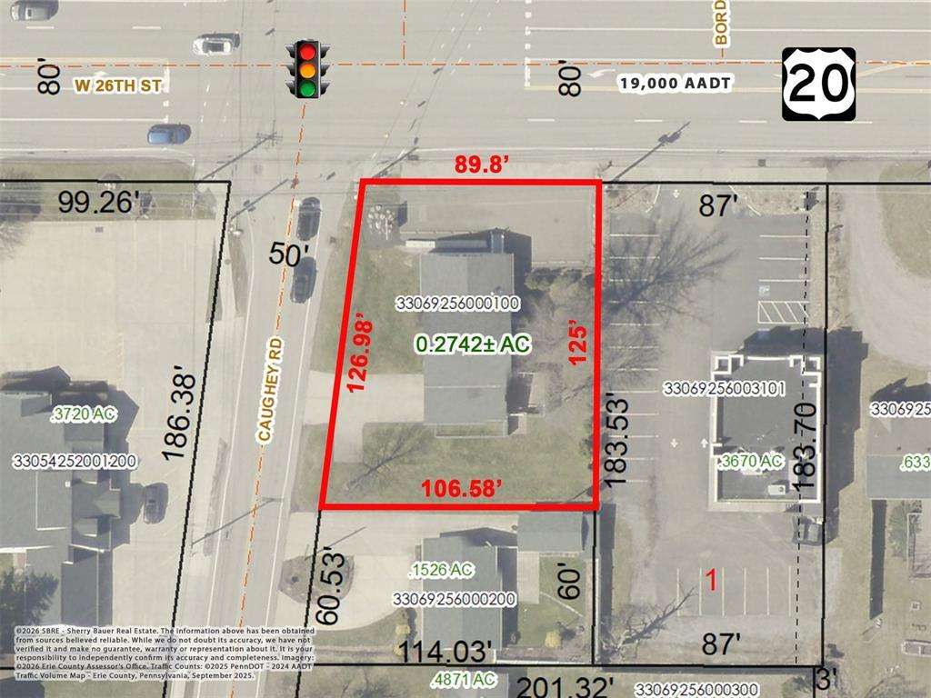 2,010±SF mixed-use building for sale on a 0.27± acre corner lot at a signalized intersection along W. 26th Street, a high traffic corridor with 19,000 average daily traffic (PennDOT 2024 count year). Exceptional visibility & an ideal layout for a variety of uses: live-work, retail, office & more. 512±SF commercial space, formerly a salon, with 9-car parking lot, open area, restroom & kitchenette. 3 bedroom, 1.5 bath connected residence was recently renovated & features an open floor plan for kitchen/dining room/living room with gas fireplace, sun room, patio, basement, attached garage & fenced dog run. Potential for 1,441±SF first floor commercial space & 618±SF second floor office/storage. Floor plan available. Curb cuts on both W. 26th St & Caughey Rd - potential for additional wrap around driveway &/or extra parking. Both units have gas forced air heat, central AC & separate electric meters. Zoned MU-2, this property is primed for retail, office, pet grooming, day care & more.