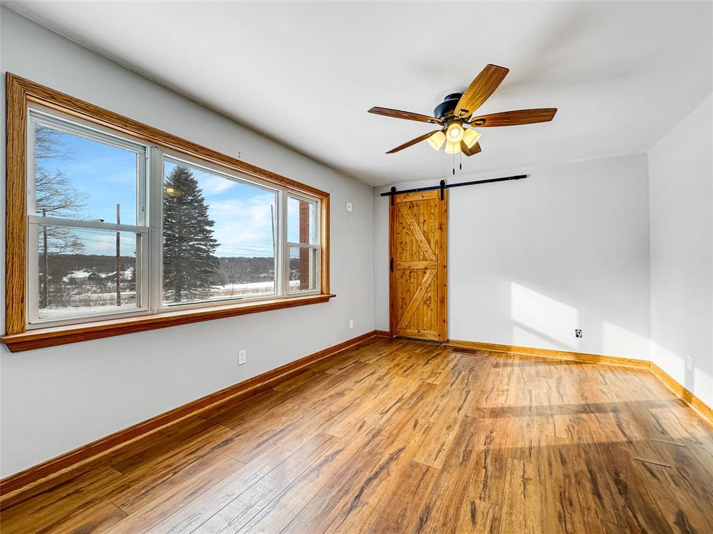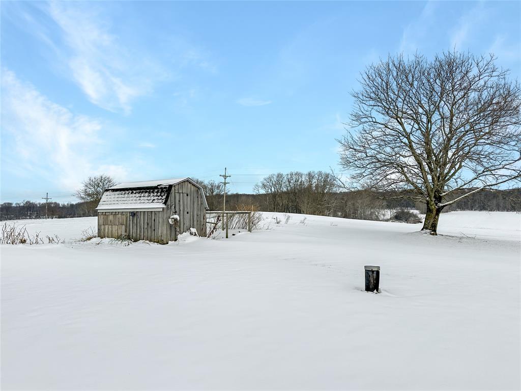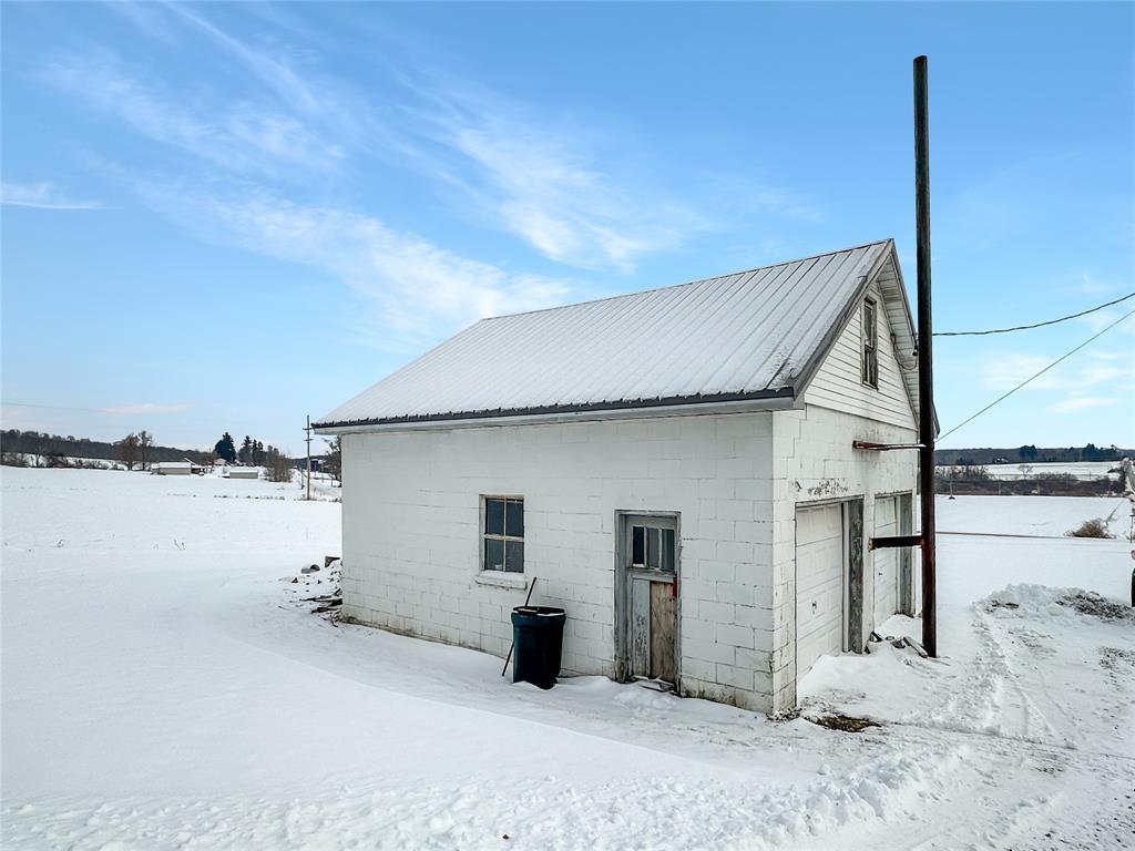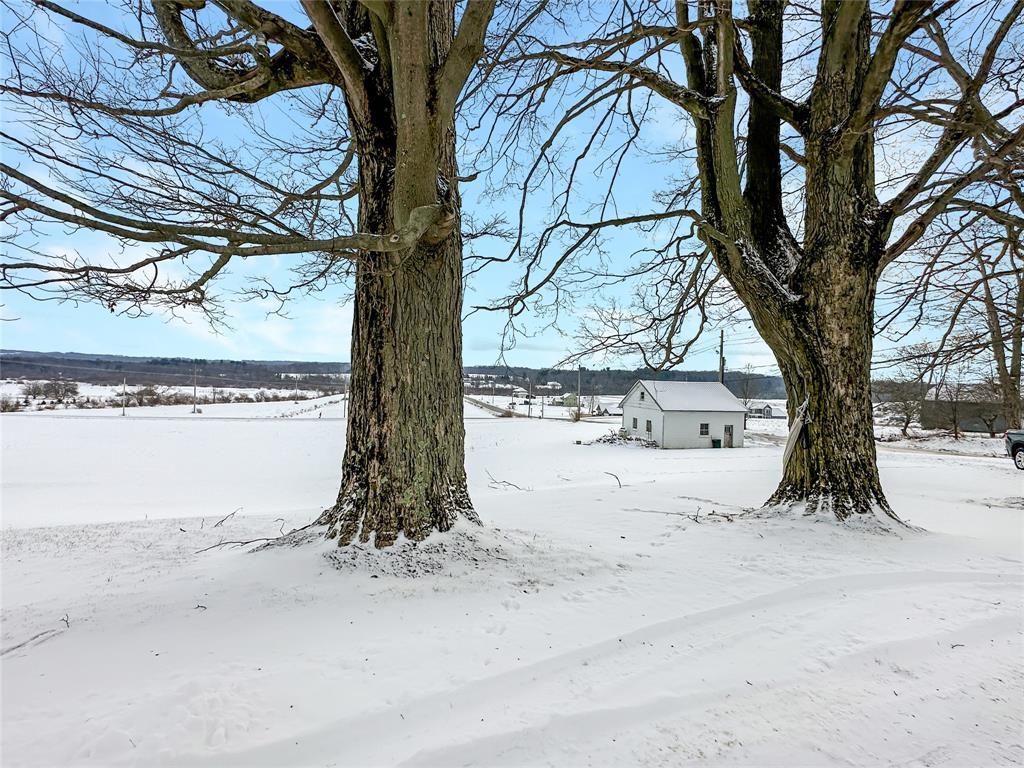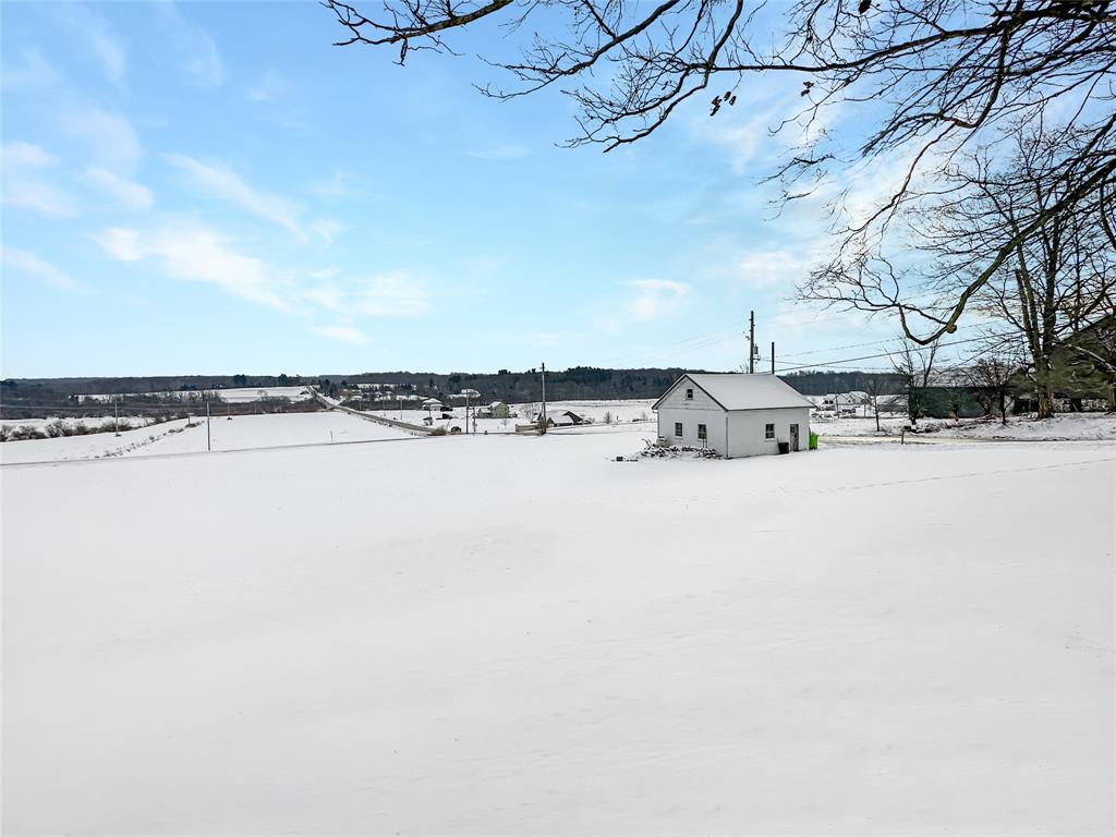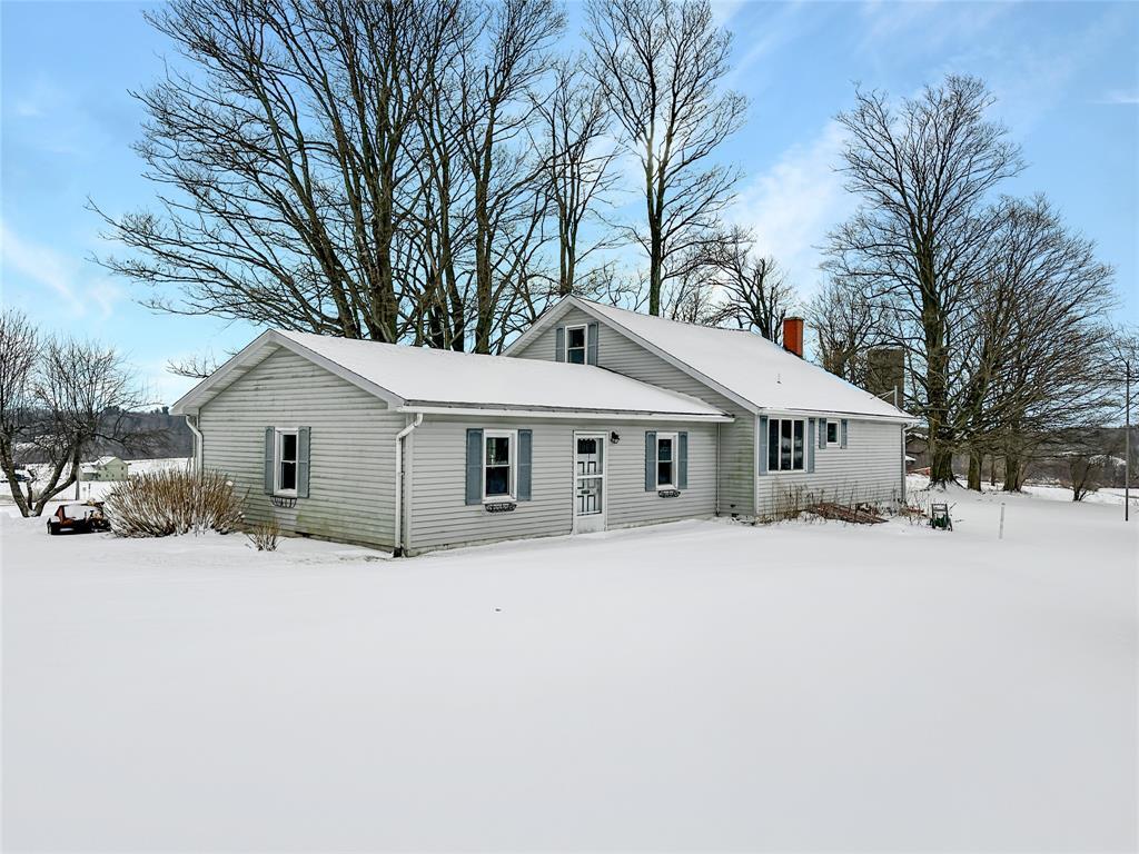 Charming 3-bedroom farmhouse perched on a knoll with stunning views of the rolling countryside. Features a 2-car attached garage and an additional 2-car detached garage. The first floor boasts new trim and doors, along with new laminate flooring throughout. The living room offers a vaulted ceiling and a cozy woodburning fireplace. The primary bedroom is on the first floor with an unfinished space ideal for a future bath or walk-in closet. Upstairs bedrooms include built-in drawers, with the second bedroom being captive, plus additional electric baseboard heating. Located in the General McLane School District. High speed internet is available through Armstrong Cable.