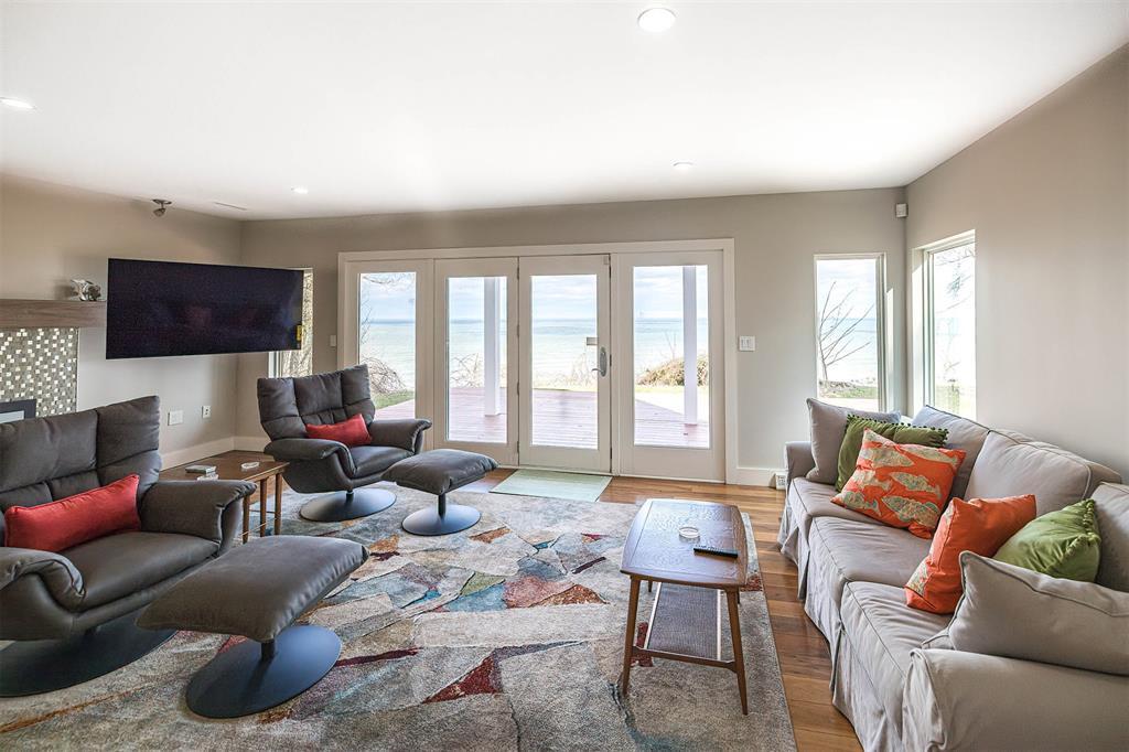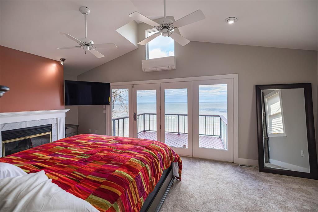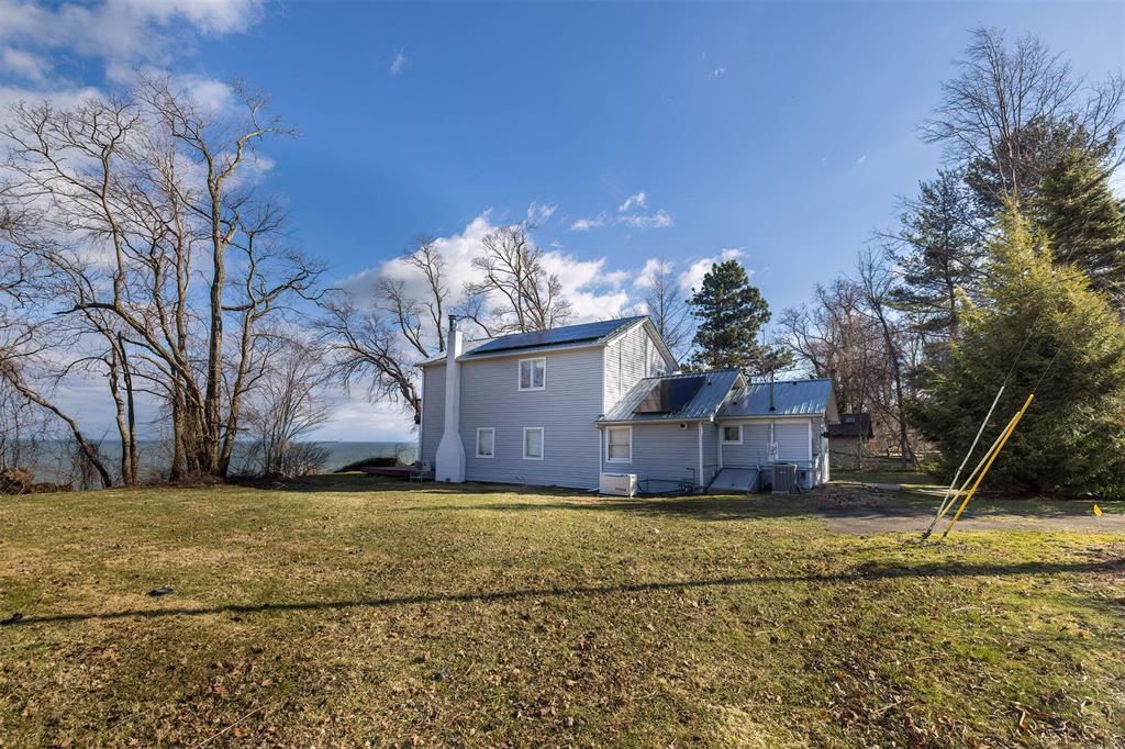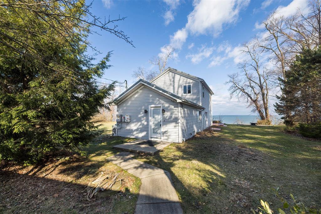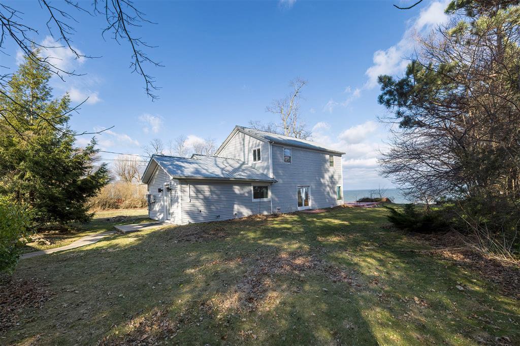 Welcome home to your private lakefront haven! Stunning and modern 2-story home sitting on a double lot offers plenty of privacy and panoramic views of Lake Erie. Designed with sleek architectural elements throughout, this contemporary home features gleaming hardwood floors and an upgraded kitchen with newer cabinets, countertops and pantry area. Open concept living and dining area with gas fireplace and direct lake views. First floor bedroom with built-in Murphy bed and laundry area. Second floor primary suite features a private balcony with prime views, wood-burning fireplace and supplemental AC/heat pump. Primary bath includes a tiled shower, soaking tub and WIC. Recent updates include: newer metal roofs, freshly painted interior, complete exterior siding replacement, updated security system and solar panel installation for incredible utility savings. Also featuring a Generac whole home generator and a detached pole barn with plenty of space to house outdoor recreation.