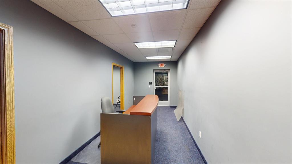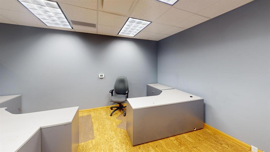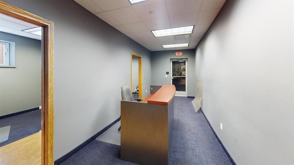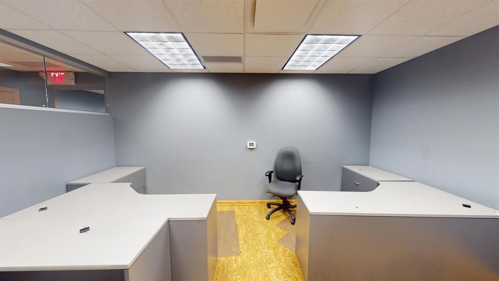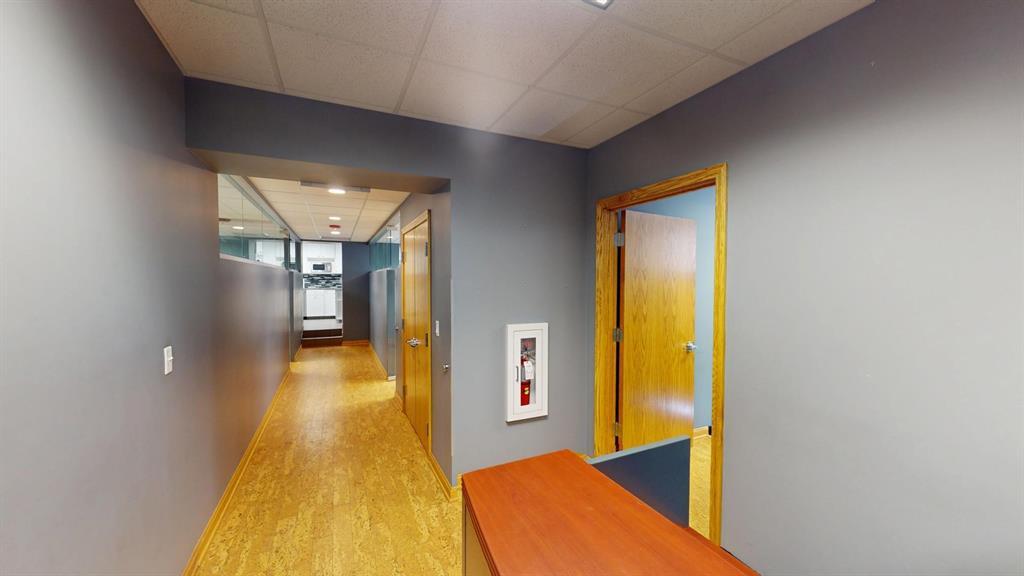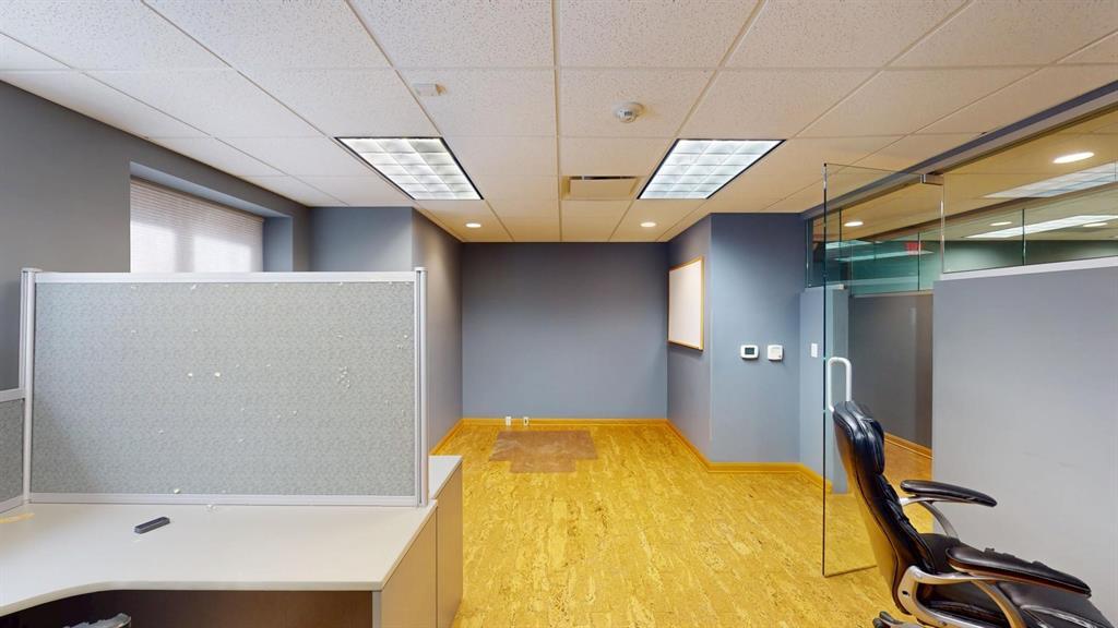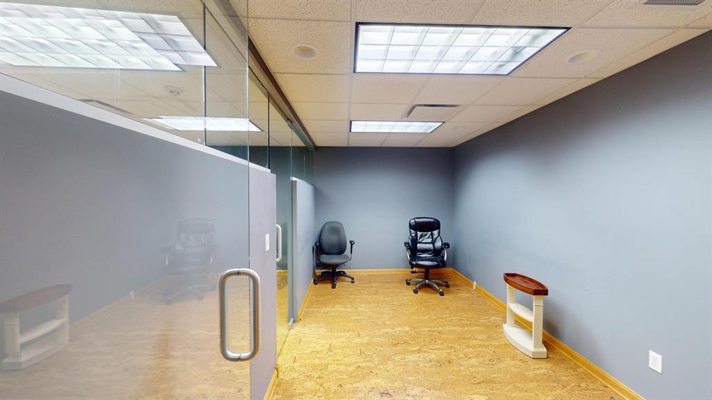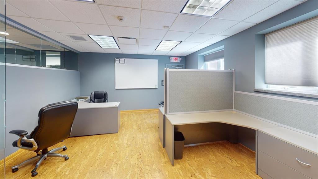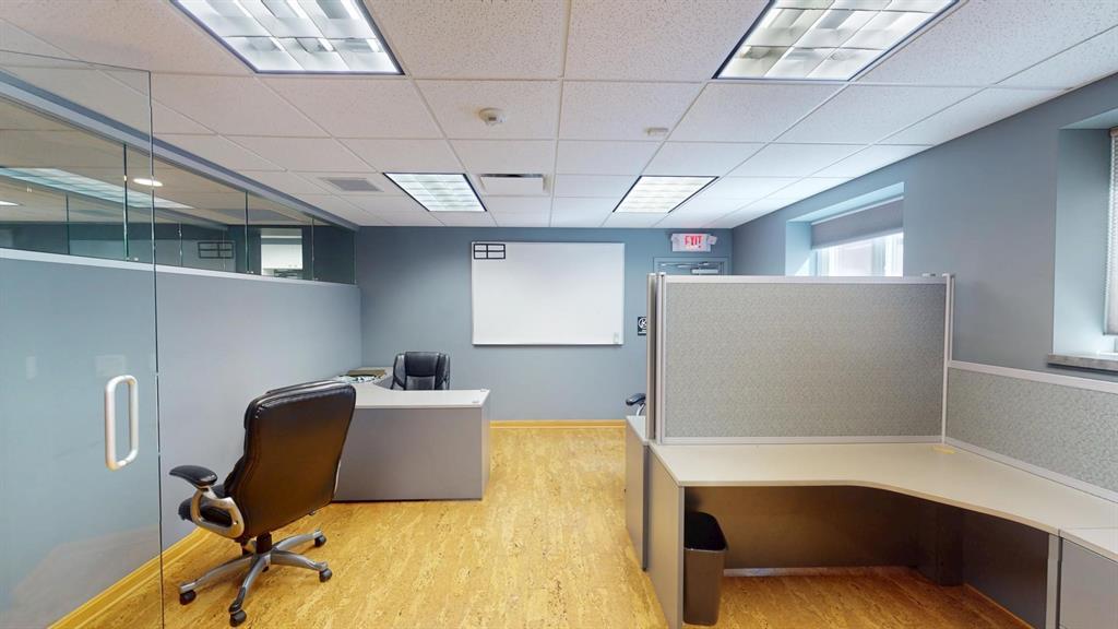 Modern workspace featuring a welcoming reception, four private offices, a spacious conference room, and a kitchen. Three-quarter height walls topped with glass panels create a bright and open atmosphere.