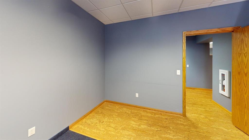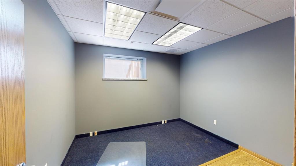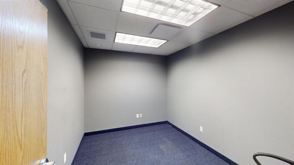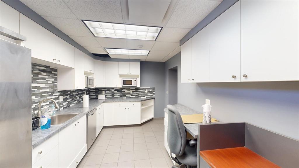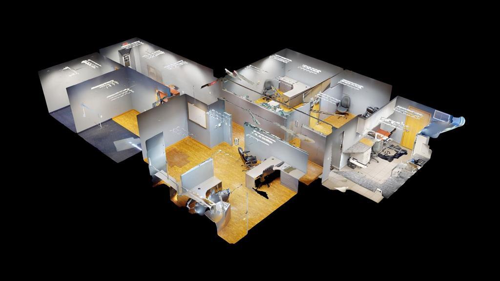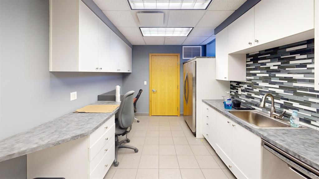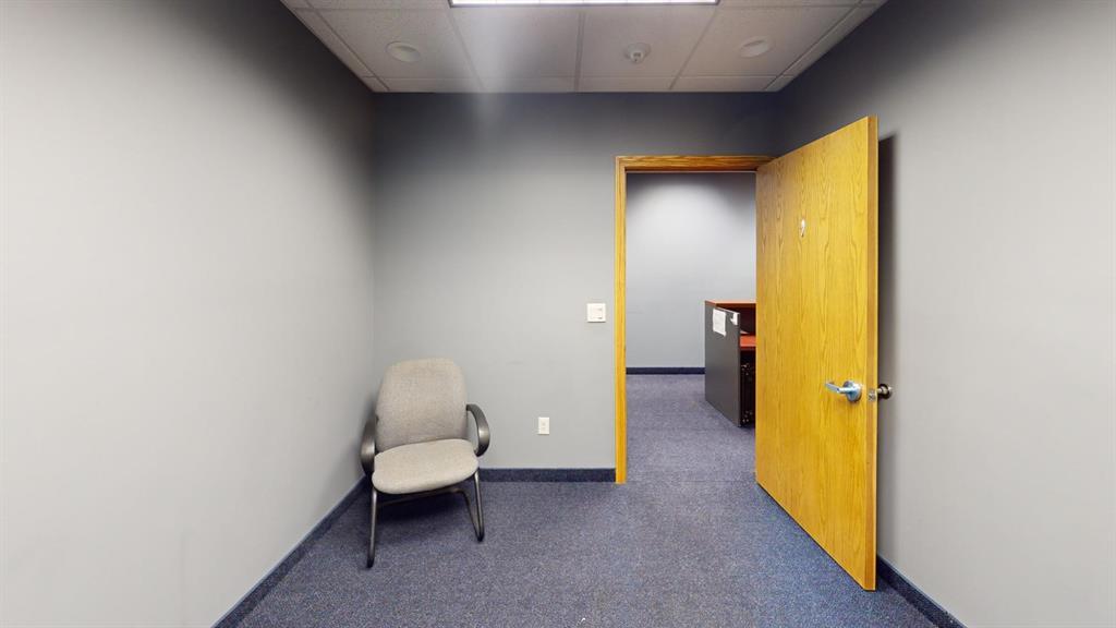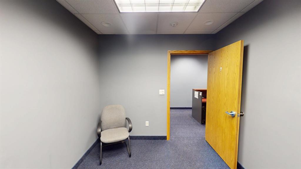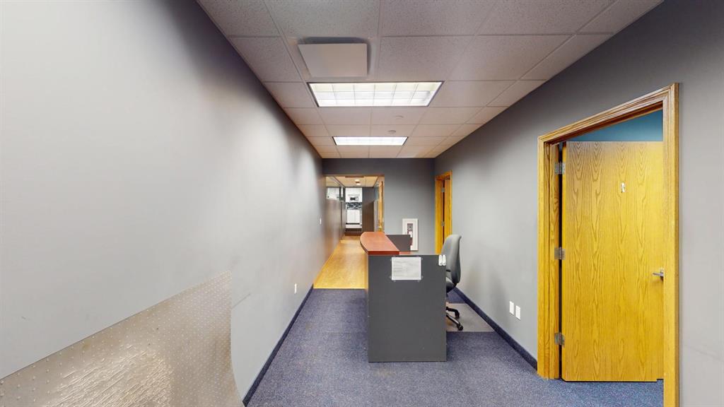 Modern workspace featuring a welcoming reception, four private offices, a spacious conference room, and a kitchen. Three-quarter height walls topped with glass panels create a bright and open atmosphere.