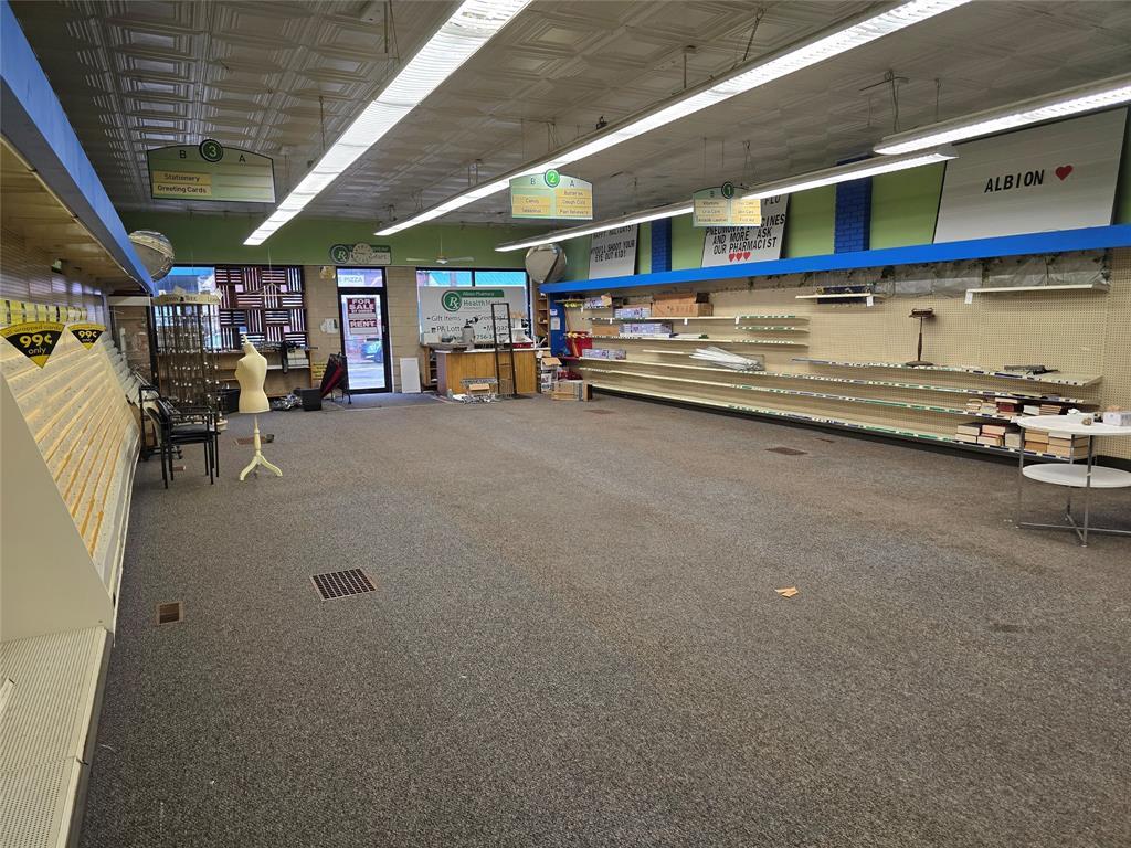 Prime downtown Albion 2 story commercial building with beautiful tin ceilings, a large show room, 1/2 bath and full basement. A full extra lot for plenty of parking-corner lot. The roof is rubber.