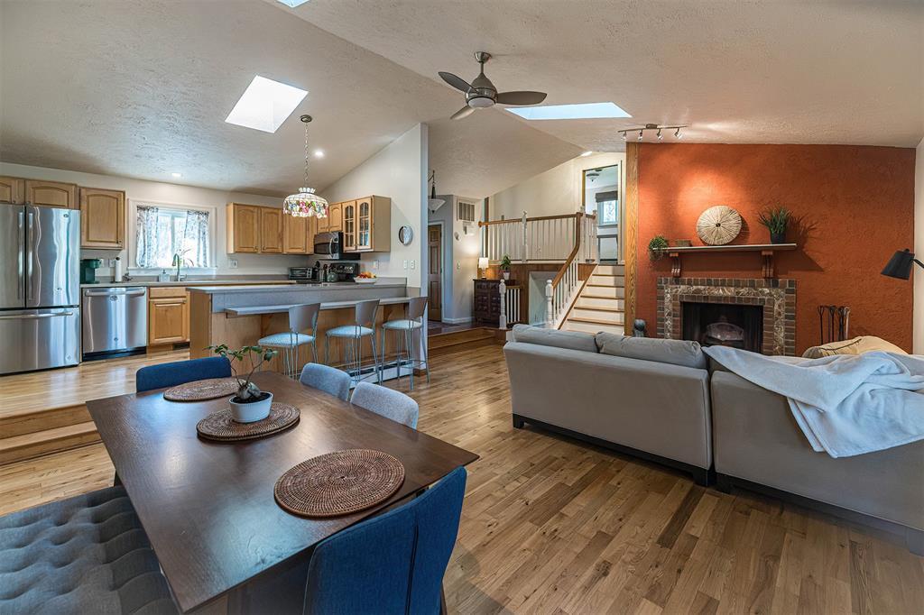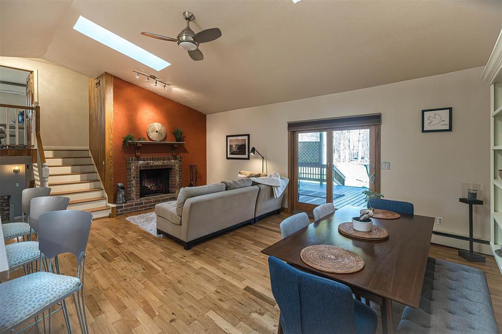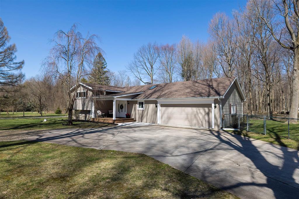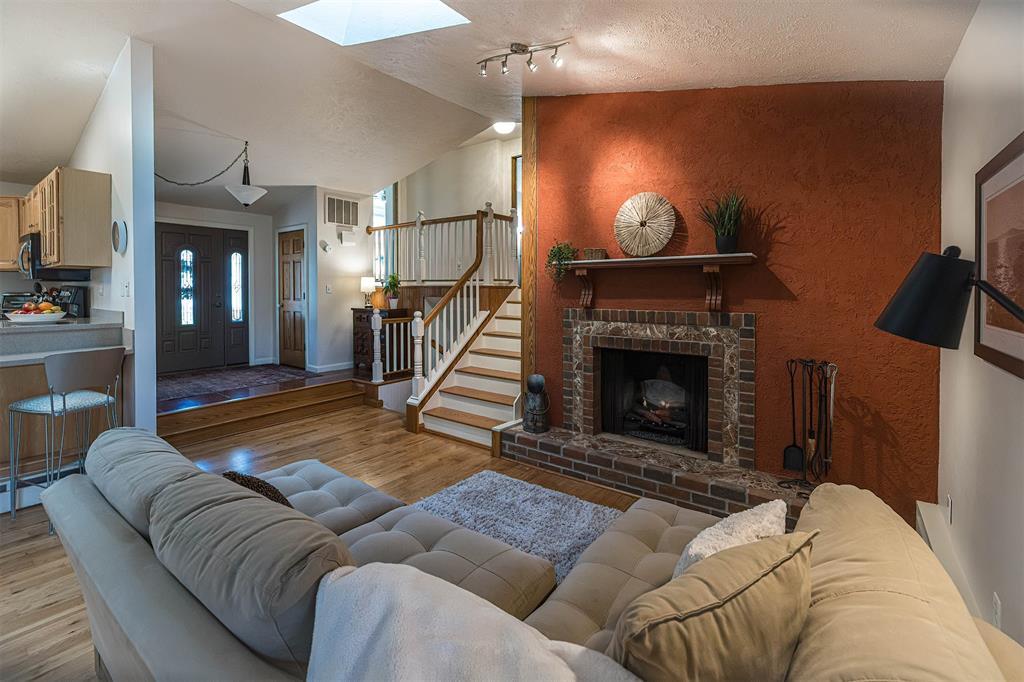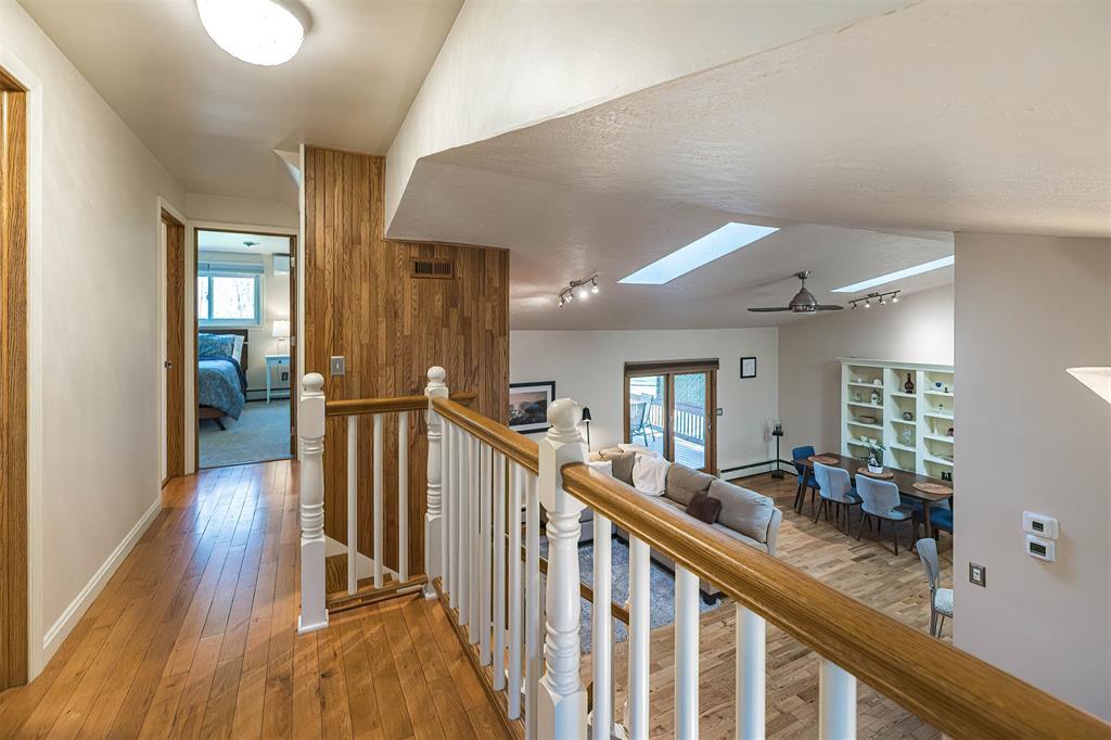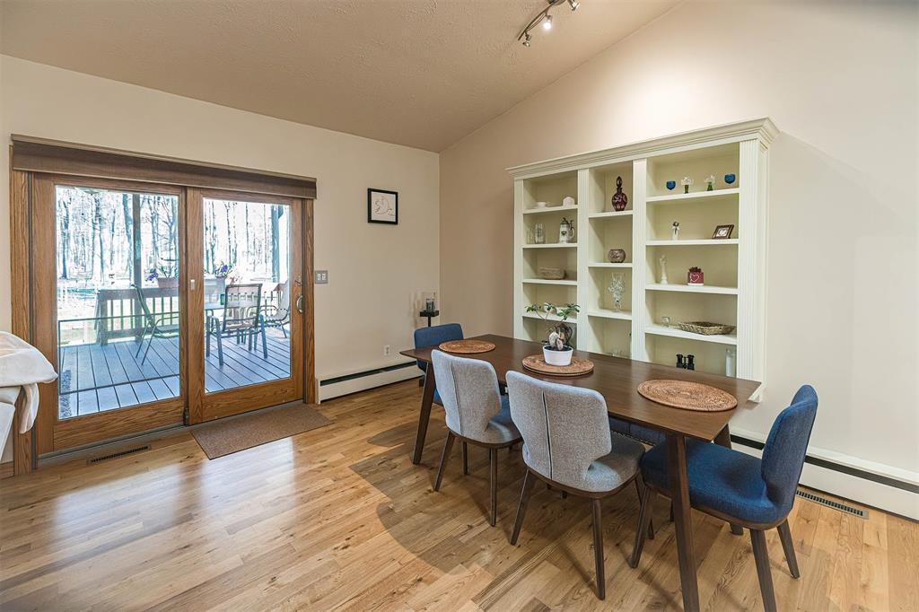 YOU'LL LOVE THIS HOME AND IT'S GREAT LOCATION. IT'S SITUATED ON A PRIVATE ROAD AND HAS WONDERFUL WOODED VIEWS FROM MANY WINDOWS. DRAMATIC VAULTED CEILING WITH ITS MANY SKYLIGHTS MAKES THIS HOME SO WARM AND INVITING. THERE ARE 2 STUNNING WB FIREPLACES W/ CUSTOM ELECTRIC (FERRIER'S) INSERTS. DELIGHTFUL MAPLE KITCHEN W/ SOFT CLOSE CABINETRY, WITH AN INVITING BREAKFAST BAR W/ STOOLS. THE SOLID HARDWOOD FLOORS ALSO ADD A SPECIAL TOUCH. THE BEDROOMS ALL HAVE LARGE CLOSETS. OVERSIZED BRAND NEW ANDERSON WINDOWS AND CUSTOM BLINDS THRU OUT. DOWNSTAIRS YOU'LL LOVE THE FAMILY ROOM W/ BRICK DETAILS, BUILTIN BOOKCASES AND THE WALK OUT DOORS TO YOUR PRIVATE YARD.
